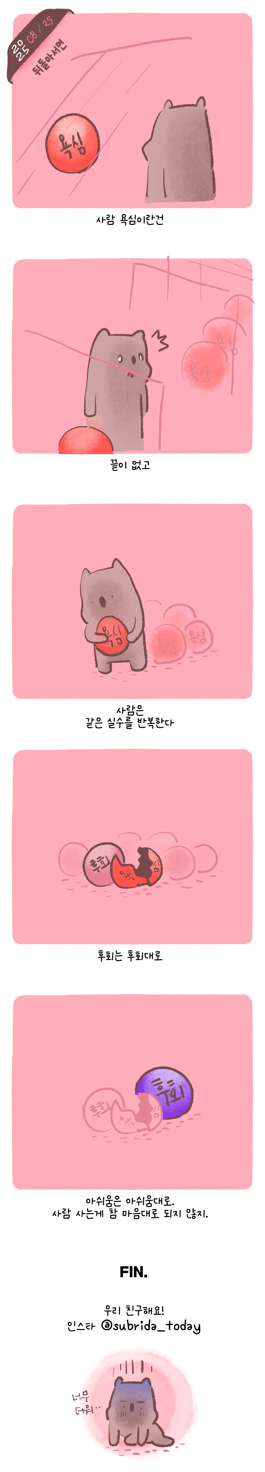 작업ㅣ스튜디오/섭섭하지 않은 쿼카 그림일기 뒤돌아서면 by 섭카 2025. 8. 25. 250825 그림일기 웹툰 뒤돌아서면후회뿐일지라도하는 게도전하는 게맞겠지.사는 게 참. 공유하기 게시글 관리 섭리다 스튜디오 '작업ㅣ스튜디오 > 섭섭하지 않은 쿼카 그림일기' 카테고리의 다른 글 여유일까 (2) 2025.08.29 변한 중고나라 (2) 2025.08.28 그런 회사 (3) 2025.08.21 기분탓 (2) 2025.08.20 인정 (2) 2025.08.19 관련글 여유일까 변한 중고나라 그런 회사 기분탓 댓글