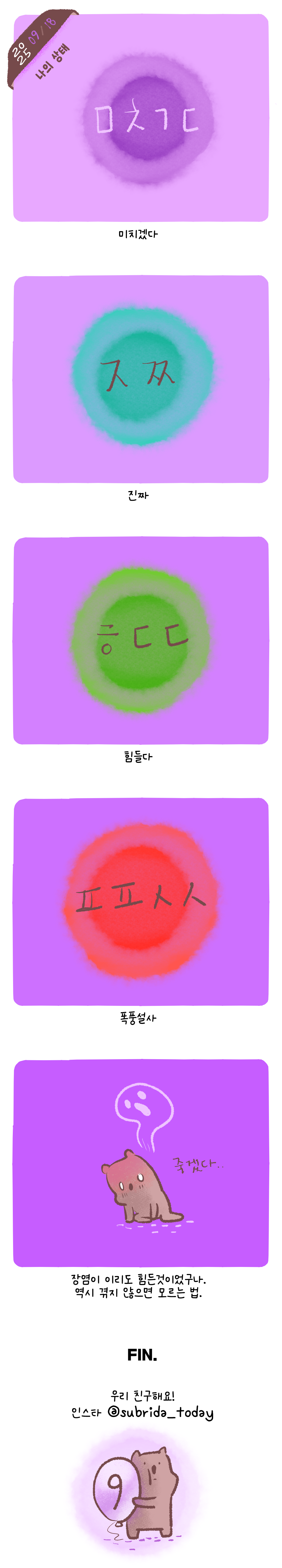 작업ㅣ스튜디오/섭섭하지 않은 쿼카 그림일기 나의 상태 by 섭카 2025. 9. 18. 250918 그림일기 웹툰 너무 힘들다 정말아픈게 최악건강이 최고. 공유하기 게시글 관리 섭리다 스튜디오 '작업ㅣ스튜디오 > 섭섭하지 않은 쿼카 그림일기' 카테고리의 다른 글 벌써 10월 (1) 2025.10.02 업데이트 (3) 2025.09.22 칭찬과 격려 (3) 2025.09.15 무기력의 이유 (3) 2025.09.10 칭찬은 (2) 2025.09.08 관련글 벌써 10월 업데이트 칭찬과 격려 무기력의 이유 댓글