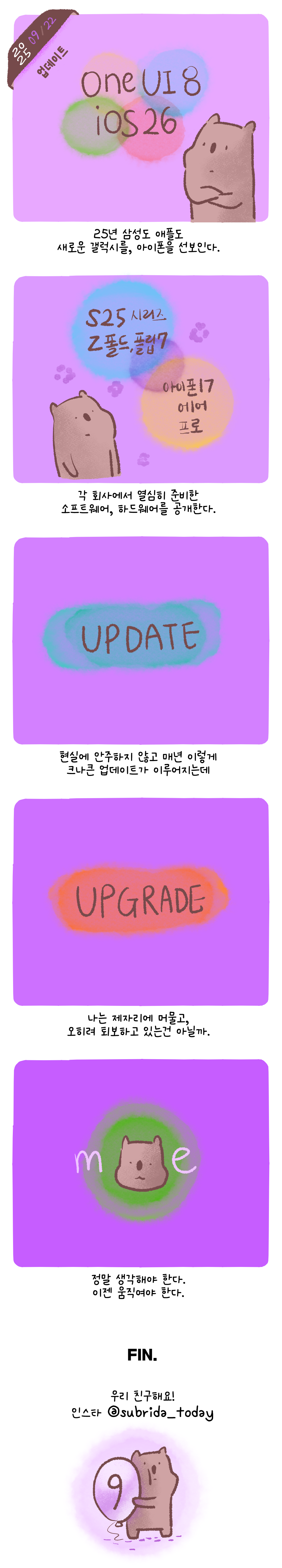 작업ㅣ스튜디오/섭섭하지 않은 쿼카 그림일기 업데이트 by 섭카 2025. 9. 22. 250922 그림일기 웹툰 매년이렇게 세상은발전하고 좋아지는데나는제자리.오히려 도태.어쩜 좋지...제발정신 좀 차리자. 공유하기 게시글 관리 섭리다 스튜디오 '작업ㅣ스튜디오 > 섭섭하지 않은 쿼카 그림일기' 카테고리의 다른 글 plan (2) 2025.10.03 벌써 10월 (1) 2025.10.02 나의 상태 (0) 2025.09.18 칭찬과 격려 (3) 2025.09.15 무기력의 이유 (3) 2025.09.10 관련글 plan 벌써 10월 나의 상태 칭찬과 격려 댓글