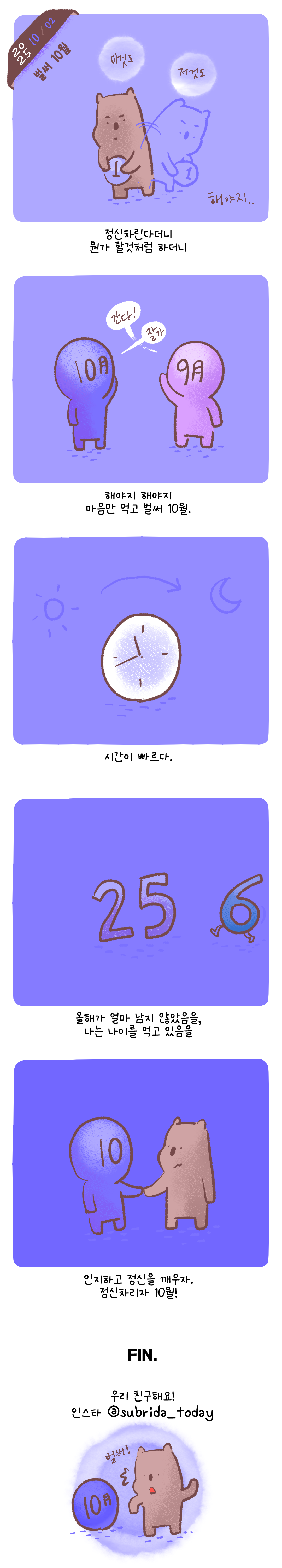 작업ㅣ스튜디오/섭섭하지 않은 쿼카 그림일기 벌써 10월 by 섭카 2025. 10. 2. 251002 그림일기 웹툰 벌써 10월이라니정말시간이 빠르다.. 공유하기 게시글 관리 섭리다 스튜디오 '작업ㅣ스튜디오 > 섭섭하지 않은 쿼카 그림일기' 카테고리의 다른 글 plan (2) 2025.10.03 업데이트 (3) 2025.09.22 나의 상태 (0) 2025.09.18 칭찬과 격려 (3) 2025.09.15 무기력의 이유 (3) 2025.09.10 관련글 plan 업데이트 나의 상태 칭찬과 격려 댓글