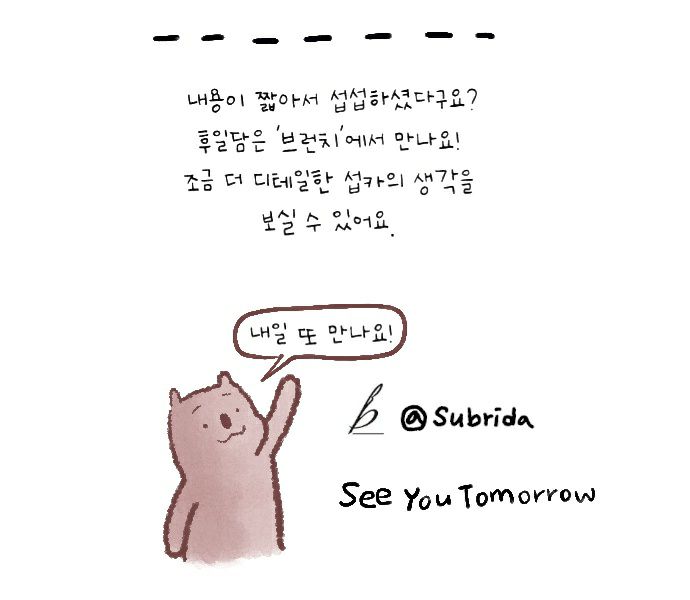 작업ㅣ스튜디오/섭섭하지 않은 쿼카 그림일기 월요일이라서 그런가 by 섭카 2021. 11. 15. 1115 그림일기 웹툰 피곤해..월요일부터 야근이구..일도 많구..내 워라밸 어쩔고야.. 공유하기 URL 복사카카오톡 공유페이스북 공유엑스 공유 게시글 관리 구독하기섭리다 스튜디오 '작업ㅣ스튜디오 > 섭섭하지 않은 쿼카 그림일기' 카테고리의 다른 글 나는 언제까지 (3) 2021.11.17 칼퇴를 하면 (3) 2021.11.16 돌싱글즈2 (1) 2021.11.14 백신 맞는 날 (3) 2021.11.13 꼰대 마인드 (10) 2021.11.12 관련글 나는 언제까지 칼퇴를 하면 돌싱글즈2 백신 맞는 날 댓글